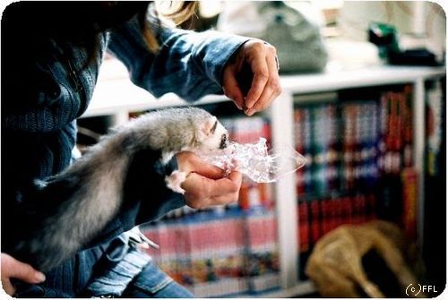 フェレットは、前向きです。 そして、いつでも信頼してくれます。 彼らは、私たちが大好きです。 いつでもケンカを挑んでくるし、 甘えて一緒に寝ようともします。 いつも力いっぱい遊んでくれるし、 病気になっても、一所懸命立ち上がります。 毎日を、楽しそうに生きているのです。 もし、毎日苦労して、泣きたくなる日があっても。 もし、たくさんの問題をかかえ、お金をたくさん遣っても、 たとえ、一緒にいる時間が、短いとしても… これだけは、断言できます。 フェレットとの暮らしは楽しい。 その暮らしの全てを、受け止めてくれるのなら、 きっとフェレットは、 あなたにたくさんの贈り物をくれると思います。 かけがえのない、素敵な贈り物を…。 |