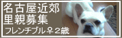 募集はいったん終了いたします。 【里親募集内容】 【種類】犬・フレンチブルドッグ(♀・2歳)(50cm・10kg) 【ワクチン】ワクチンや狂犬病予防注射済み(時期不明) 【募集地域】愛知県近郊 【受け渡し方法】 直接引き渡し。 ☆名古屋市中区栄まで飼い主さん宅まで直接迎えに行ける方限定。 【性格】 下記経緯をご参照ください。 管理人ろっこの知り合いの方が見るに見かねて保護された事から始まりました。 このフレンチブルちゃんは、募集主さんの知り合いのご家庭で育てられてきたのですが、そのお宅でお子さんが誕生した為、一緒に育てていく事が難しい、という判断に到ったんだそうです。 それではあまりに可哀想だ、という事で募集主さんが一旦保護されたのですが、引き取ってみて、新たに多くの事情を察する事ができました。 まず彼女には、他人を見ると手を目掛けて噛み付こうとする、凶暴性がありました。 違う家に連れられて不安になった事もあり、歯をむき出しにして飛び出そうとしたりと手が付けられない状態に。 飼い主さんの話と彼女の態度を見た結果、おそらくは暴力的な躾の元に育ってきたのではないか、という結論に達したそうです。 手で叩く、という話を聞いてはいたそうですが、棒で叩いているのも目撃されたんだとか。 以上のことを考えると、性格が云々以前に、おそらく一緒に暮らすにあたって、かなりの苦労があると思います。 初めて犬と暮らす方、犬の扱いに馴れていない方、フレンチブルを「大人しくて扱い易い動物」だと認識されている方には、同居は無理だと思います。 こういった問題を含め、考えてみたい、一緒に暮らしたい、と思ってくださるようでしたら、管理人ろっこまでご連絡ください。 ただ、その凶暴性は、環境によって作られたものだという事も考慮に入れていただきたいと思います。 そして迎える、迎えないに関わらず、こういったことが身近にたくさんあることや、動物と暮らす事がいかに難しいかということなど、もう一度考えてみていただければと思います。 募集主さんのうちに他にも犬がいる事などから、現在フレンチブルドッグちゃんは元のお宅にいるそうです。 【フレンチブルドッグについて】 →ワールドドッグ図鑑『フレンチブルドッグ』 |